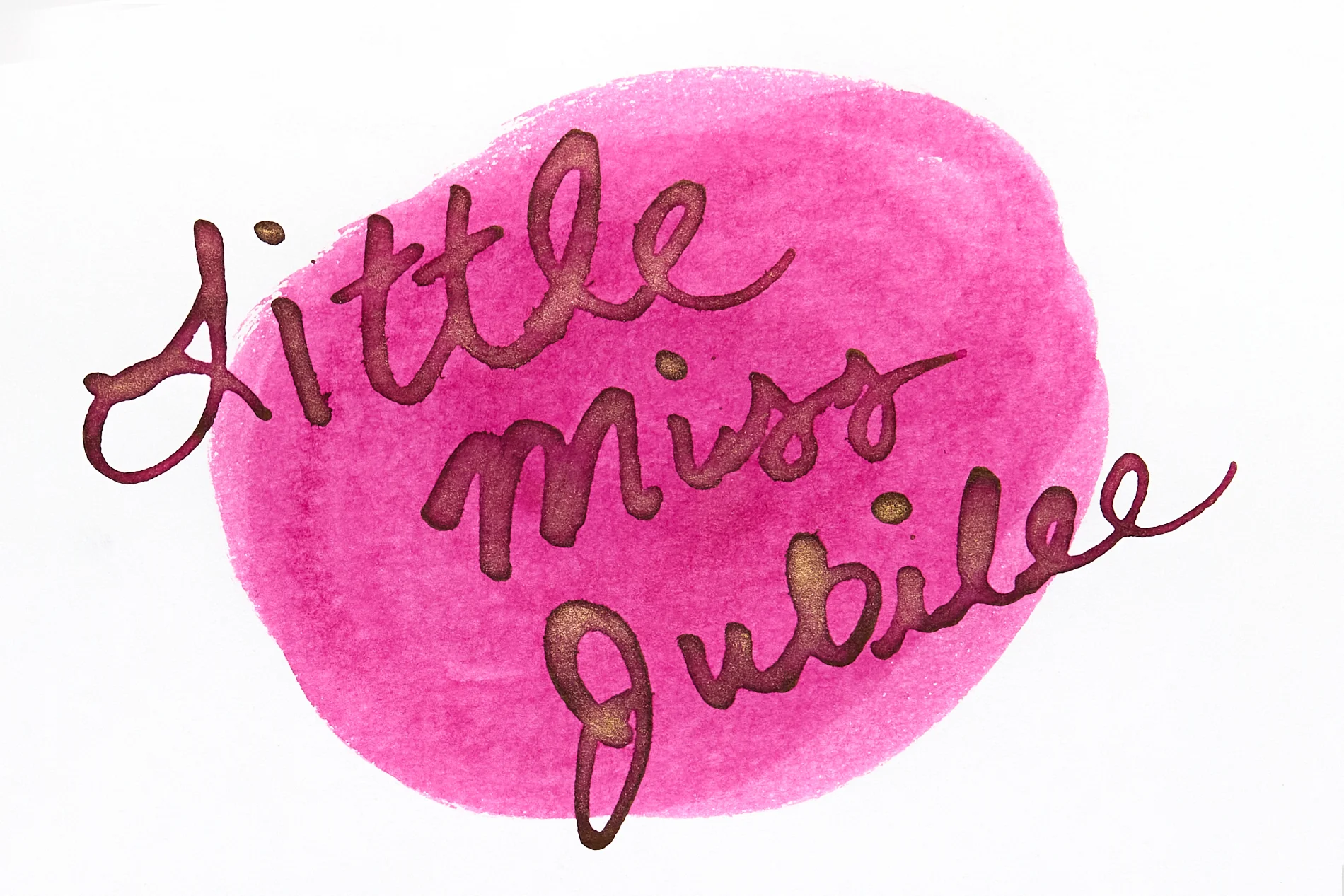38ml glass bottle of Ferris Wheel Press Little Miss Jubilee fountain pen ink, a magenta color with gold shimmer. This is a limited edition color!